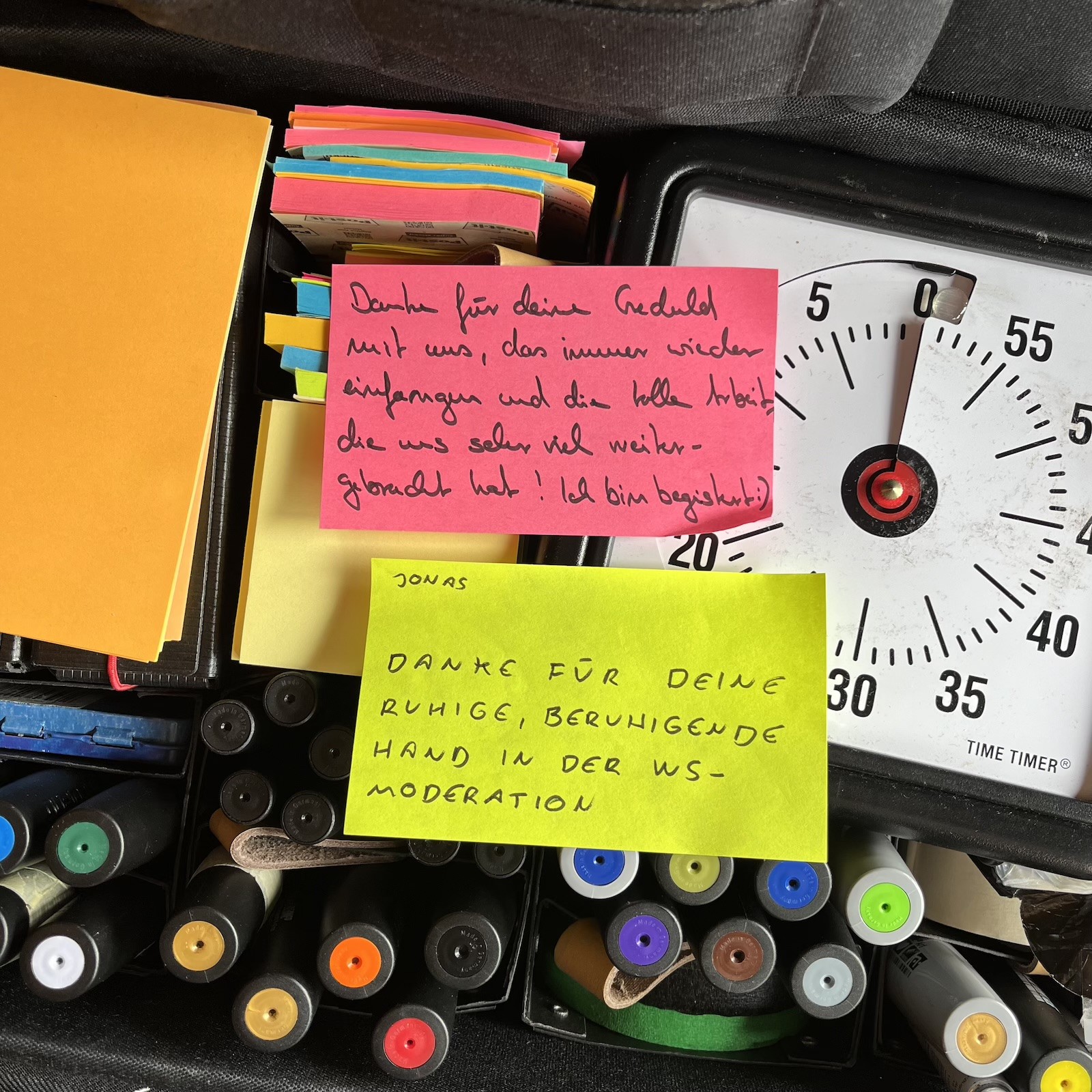 Auf Basis meiner Ausbildung entwickelte ich ein Format, das das klassische 5-Schritte-Modell der Mediation natürlich adaptiert: Ankommen, „Sandbags“ sichtbar machen (Themen und Konfliktpunkte), „Uplifts“ klären (Leid anerkennen und Interessen erhellen), Ideen entwickeln, Lösungen verhandeln. So entstanden Vereinbarungen mit Substanz, die von allen gemeinsam entwickelt und getragen wurden. Besonders im geschützten Rahmen zeigte sich, wie produktiv Konflikte wirken können, wenn man ihnen Raum gibt. Der Workshop stärkte nicht nur die Zusammenarbeit, sondern auch das Verständnis füreinander – mit klarer Struktur und konstruktivem Klima.