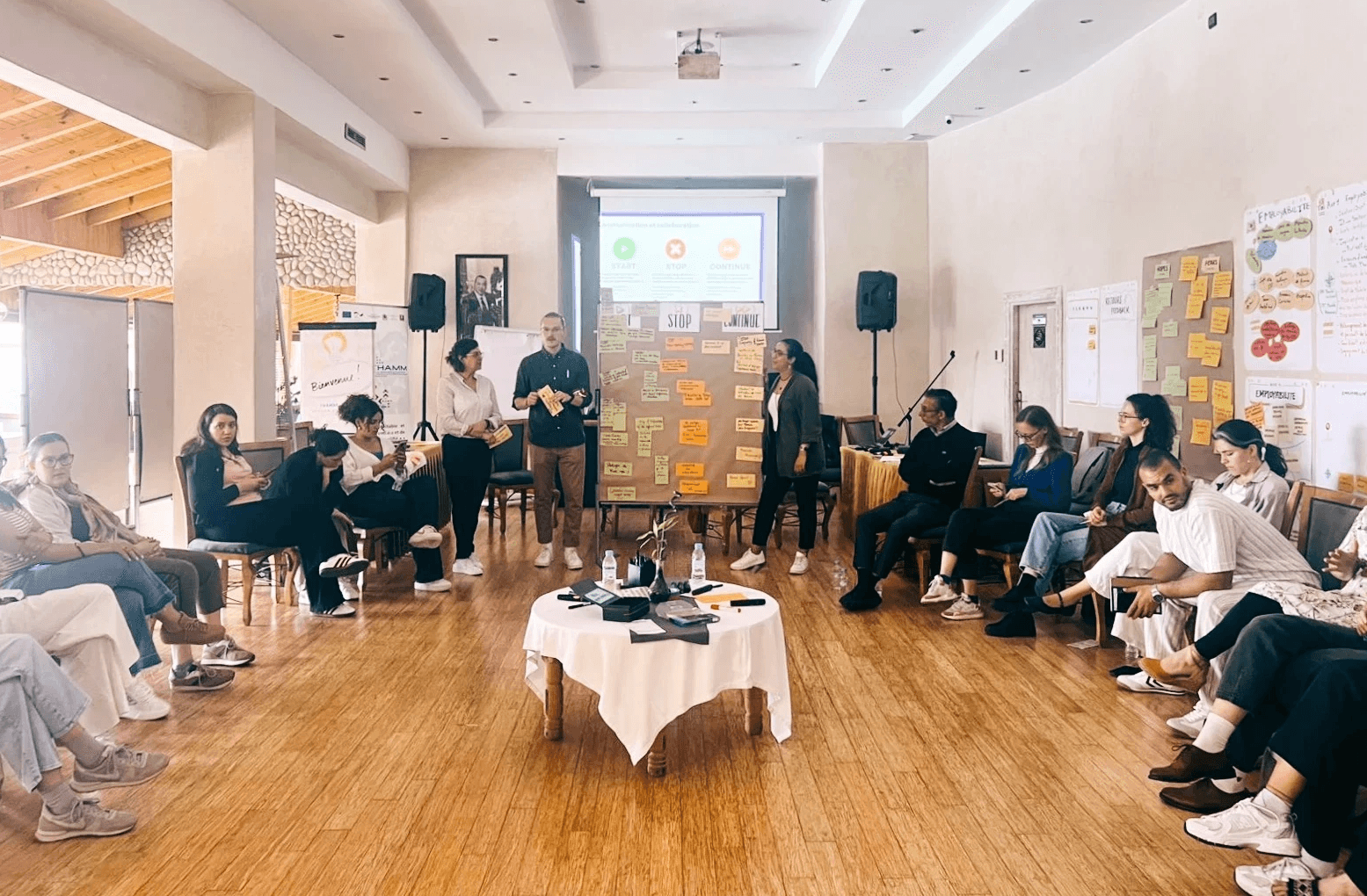 Zur Halbzeit des GIZ-Projekts THAMM Plus wurde ich eingeladen, einen mehrtägigen Workshop für das 35-köpfige Projektteam mit Kolleg:innen aus Deutschland, Marokko, Tunesien und Ägypten zu moderieren. Ziel war es, gemeinsam auf das Erreichte zu blicken, den Teamgeist zu stärken und neue Impulse für die verbleibende Projektlaufzeit zu setzen. Die Ziele sind ambitioniert: Es geht um die Förderung sicherer und regulärer Arbeitskräftemigration zwischen Nordafrika und Europa. Der Workshop fand auf Französisch und Englisch statt – und sollte möglichst barrierearm gestaltet werden, um alle Kolleg:innen aktiv einzubeziehen.
